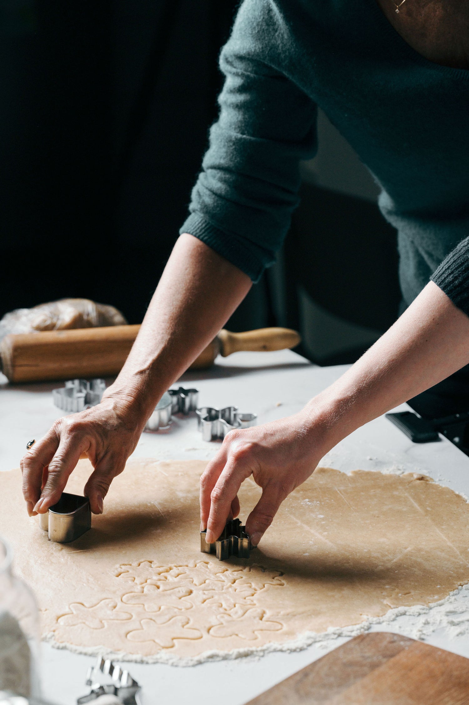 Une fois les ingrédients mélangés, la pâte est pétrie à la main, et les biscuits sont découpés à l'emporte-pièce selon les petites silhouettes sélectionnées pour la saison.